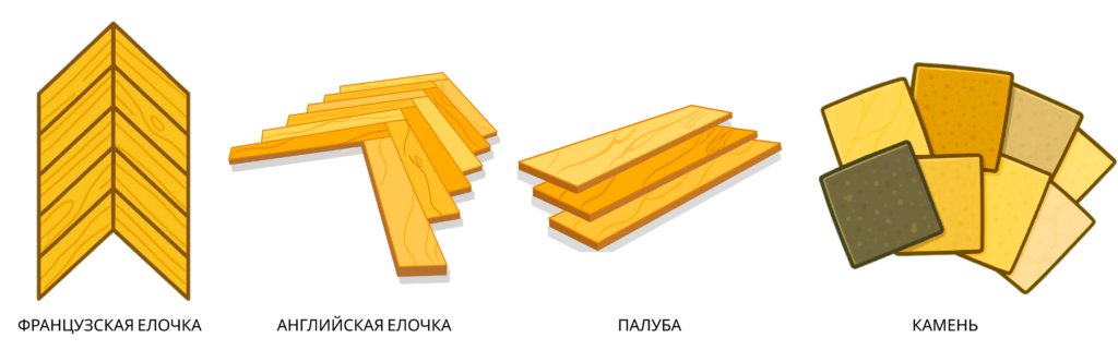 Кварц-паркет представлен в разных стилях укладки: французская ёлочка, английская ёлочка, палуба и под камень.